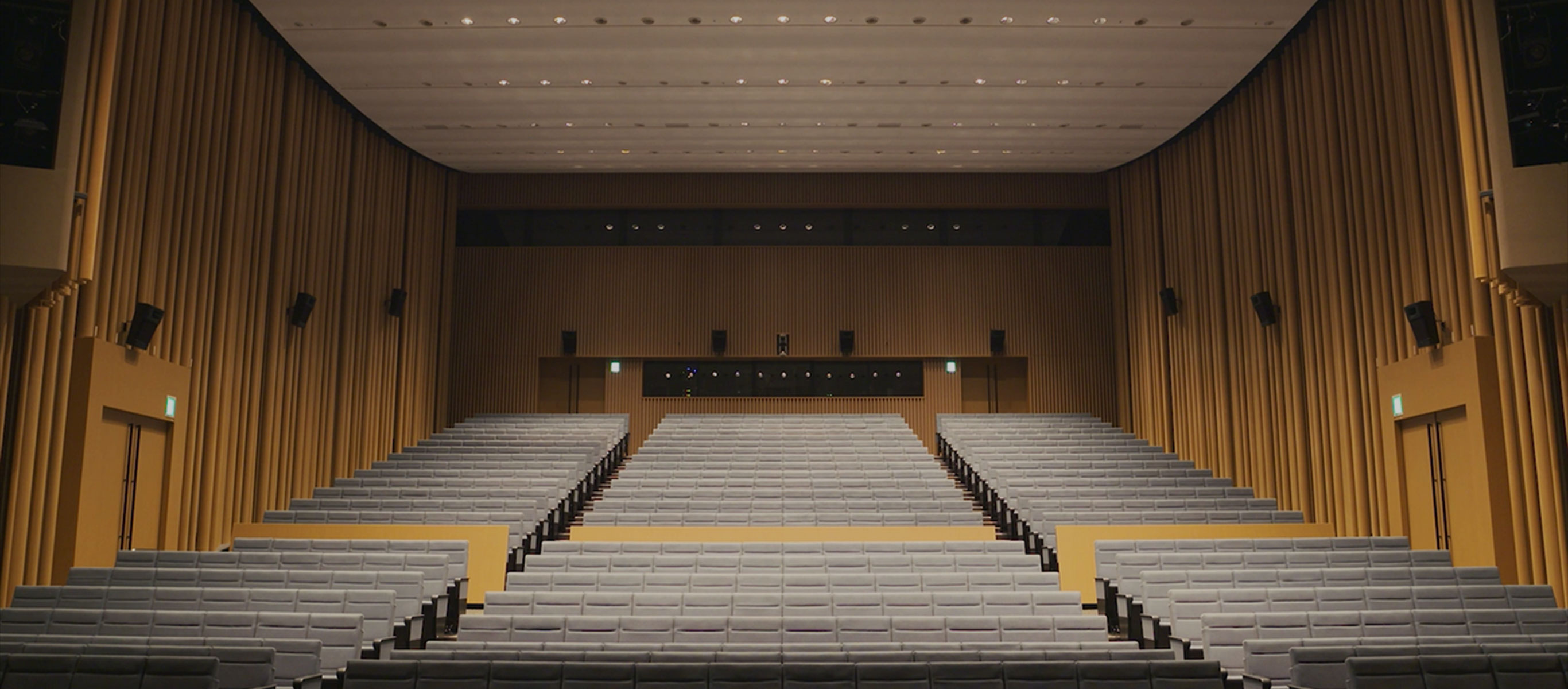 ケーブルのたるみが起きない巻上機は、最大巻取長が「25 m」と「35 m」の2種類があり、あらゆる天井高に対応できます。巻上機の数により1点吊、2点吊、3点吊、それらを複合した多点吊(最大64点吊)を構成し、多目的ホールの3点吊や大規模音楽ホールの多点吊など、さまざまなホールでご利用いただけます。