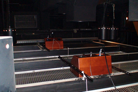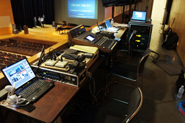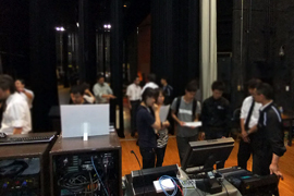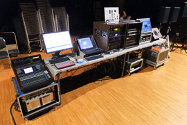 今回のデモンストレーションでは、客席上手後方にミキサーとAFCシステムラックを設置、天井裏には仮設スピーカーを合計20台設置させていただきました。